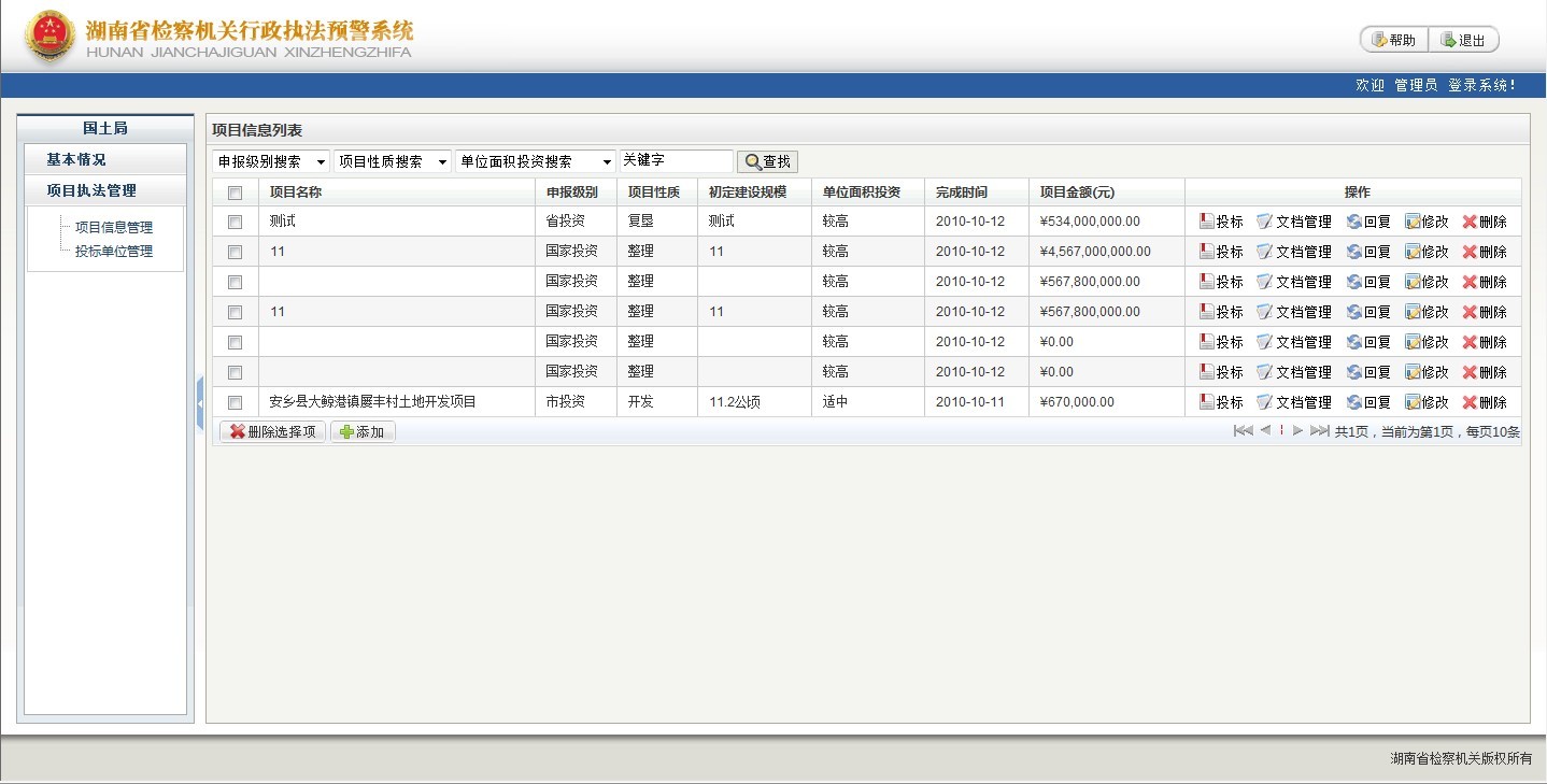對項目信息的管理,包括競標單位的信息維護、項目信息增刪改基本的維護、項目的競標信息、項目的文檔管理及與檢察部門的信息交流等功能模塊。